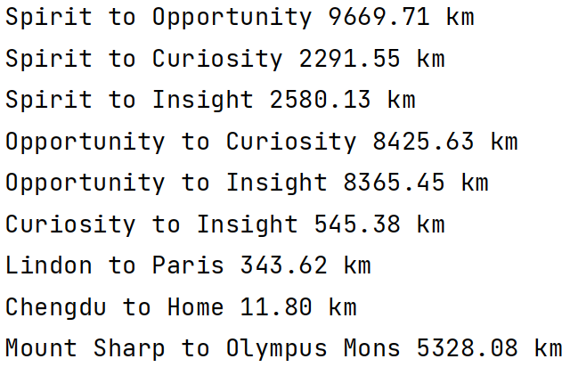 fmt.Printf("Spirit to Curiosity %.2f km\n", mars.distance(spirit, curiosity))