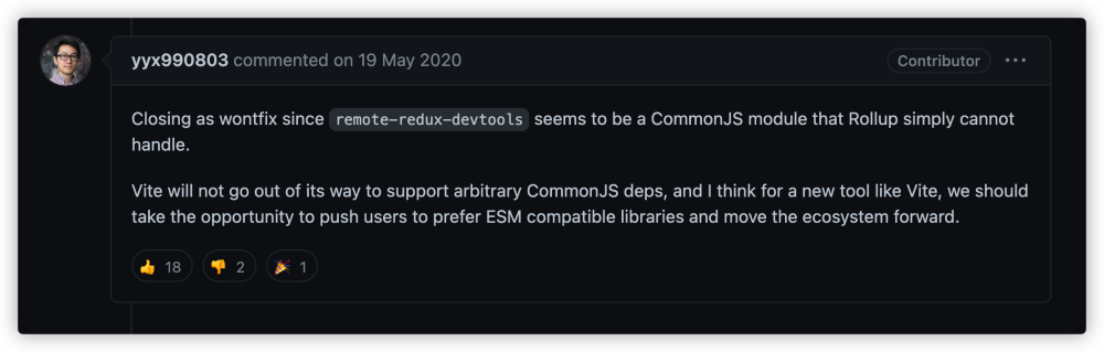 Because this problem is very serious, vite later introduced the functionality of dependency pre-bundling, and one of its important purposes is to solve the CommonJS and UMD compatibility issue. Currently, vite will first convert the dependencies published in CommonJS or UMD format to ESM, and then recompile them. This can also be understood as a compromise between speed and business.